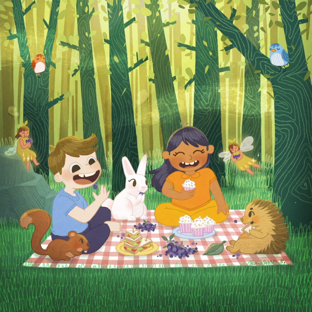 The brief for this demo task was to imagine a magical forest, where two children are having a picnic with animals and fairies. These are the two distinct style I chose to visualise this scene.